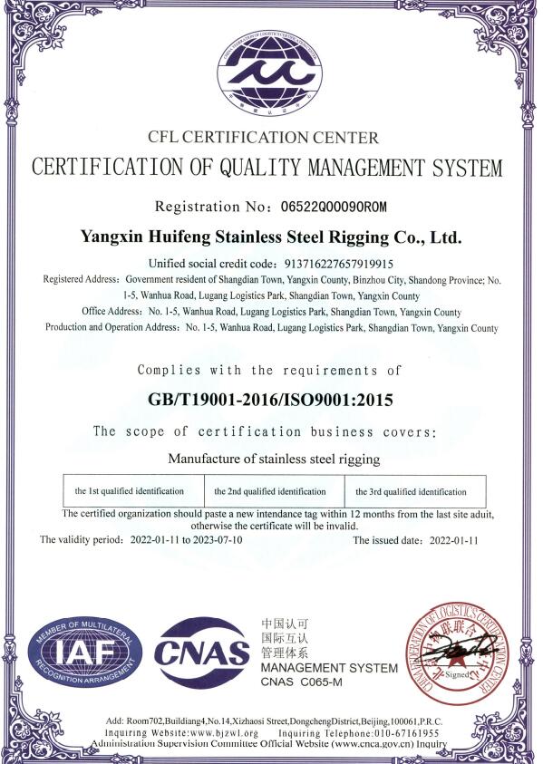 Huifeng Rigging is a registered trademark of Yangxin Huifeng Stainless Steel Rigging Co., Ltd. The company was established in 2004 and is located in the world’s stainless steel production base: Yangxin County, Shandong Province, China. It is a leading enterprise in the stainless steel rigging industry integrating product development, production and sales. The company has more than 300 employees and an annual industrial output value of more than 16 million US dollars.